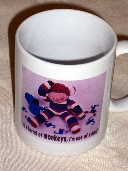 Now you can buy your very own coffee mug with Bert the sock monkey on it, playing with his toy monkeys. The mug says, " In a barrel of Monkeys I'm one of a kind.